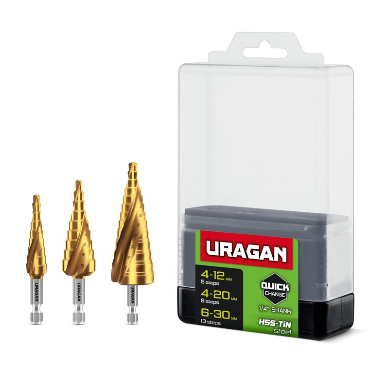 Набор сверл Uragan 29658-4-30-H3 3 шт, 4-30мм, винтовая спираль, ступенчатых